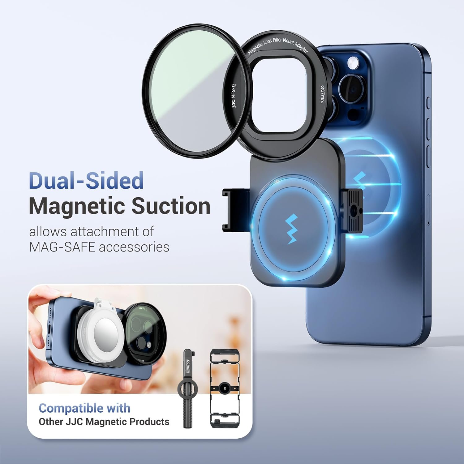 The innovative dual-sided magnetic design allows for rapid and secure attachment of filters. The inner side features 18 heavy-duty magnets that firmly attach the adapter to your phone, while the outer side boasts 36 magnets that can connect to other magnetic devices such as stands, selfie mirrors, and stabilizers.