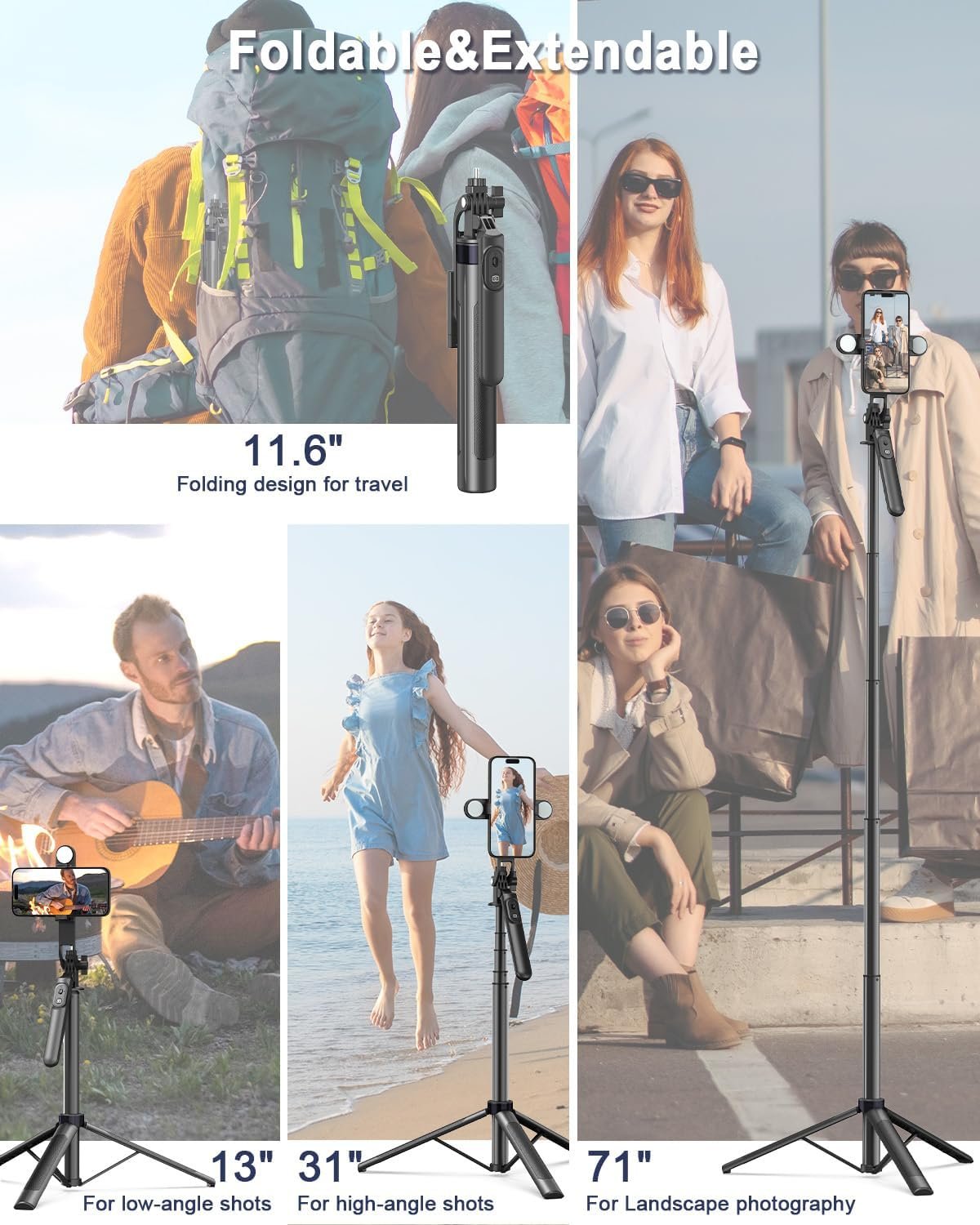 The tripod offers exceptional adjustability with a 360° swivel head, 270° tilt, and a 360° balancing handle. These features allow you to capture unique angles and panoramic views effortlessly. The tripod can be adjusted from a compact 11.6 inches to an impressive 71 inches in height, providing flexibility for any shooting situation. The package includes everything you need: 1x selfie stick, 2x LED fill lights, 1x Bluetooth remote control, 1x carrying case, and 1x user manual.