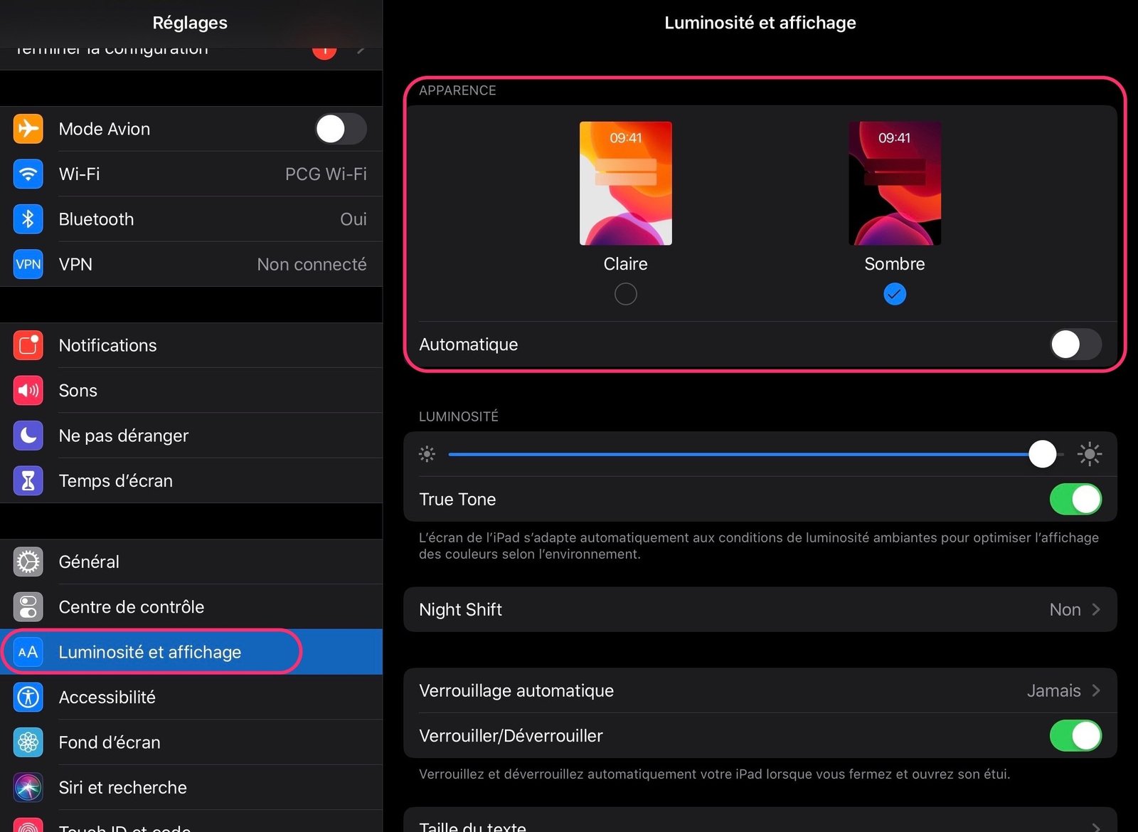 Note that the dark mode is particularly useful in addition to the Night Shift mode and the luminosity adjustment, to limit the lighting of the screen as much as possible in the environments with little light.