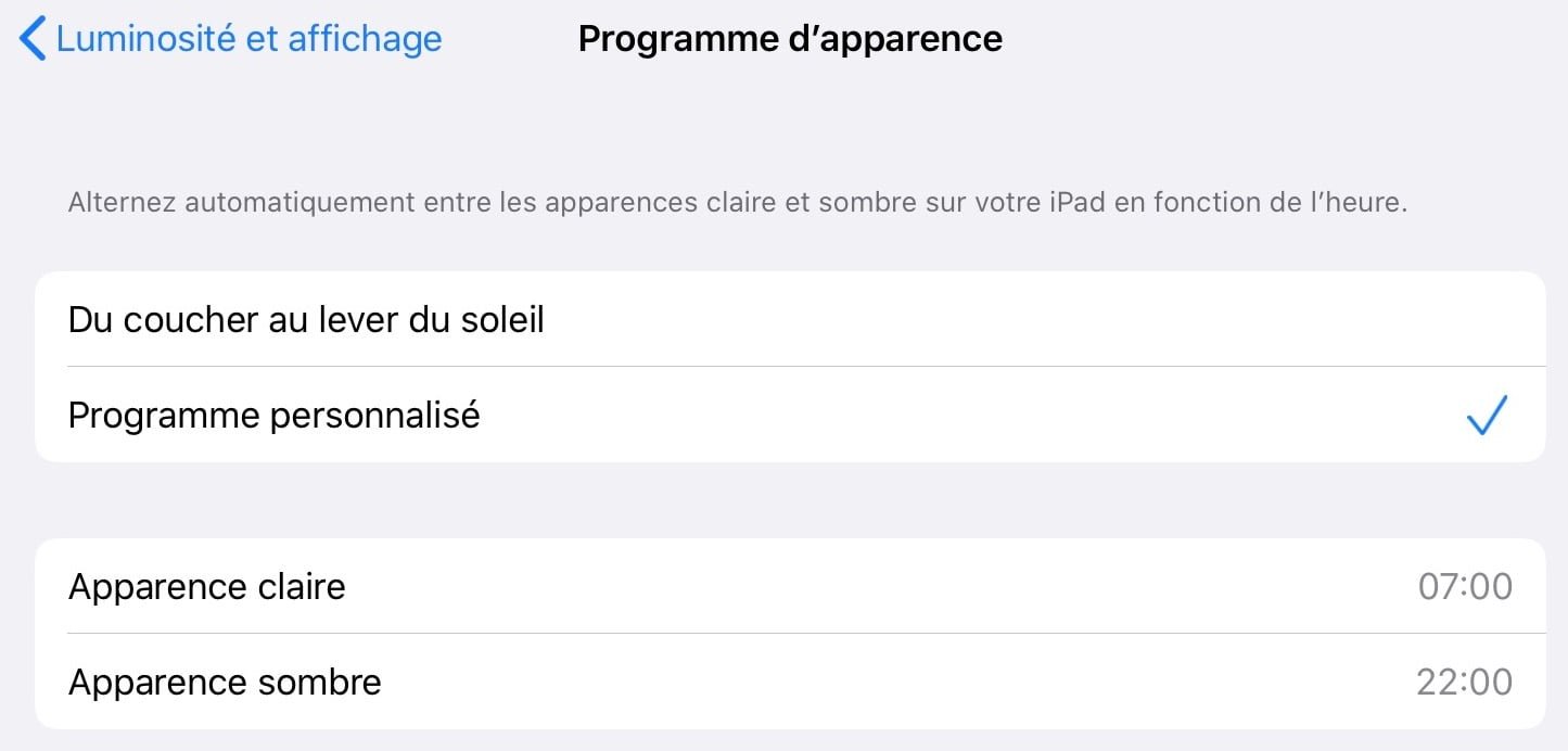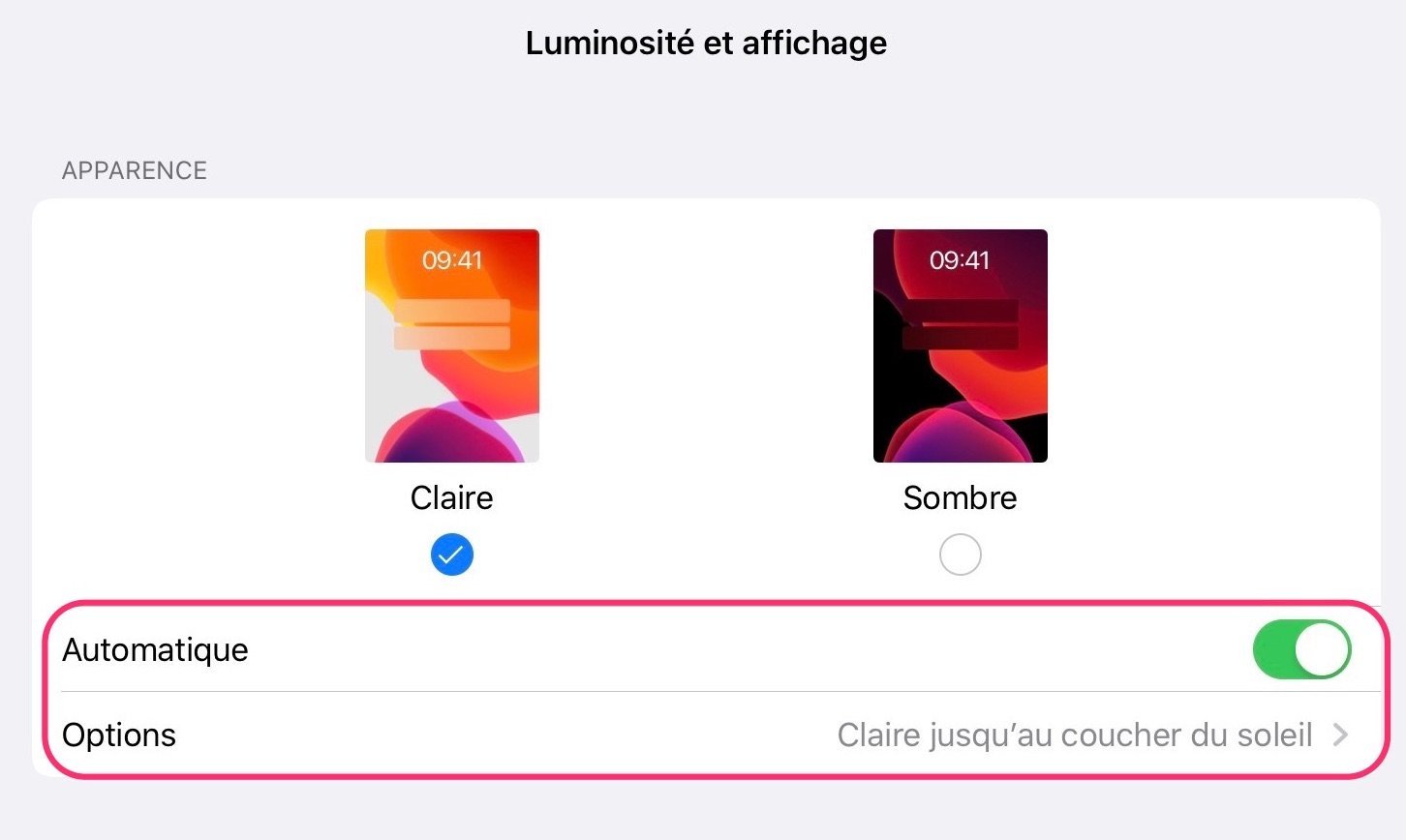 There is then a adjustment just below, called “options”. By pressing on it, the user can define how iPad or iPhone must alternate between dark appearance mode and clear appearance mode.