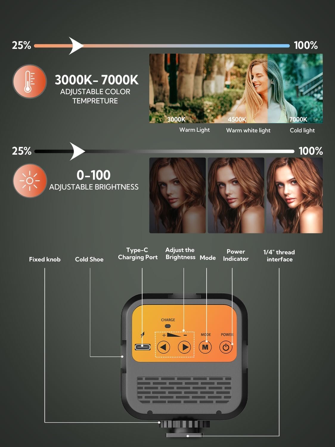 7. Battery Life: The built-in rechargeable battery for the LED light may require frequent charging during extended filming sessions.