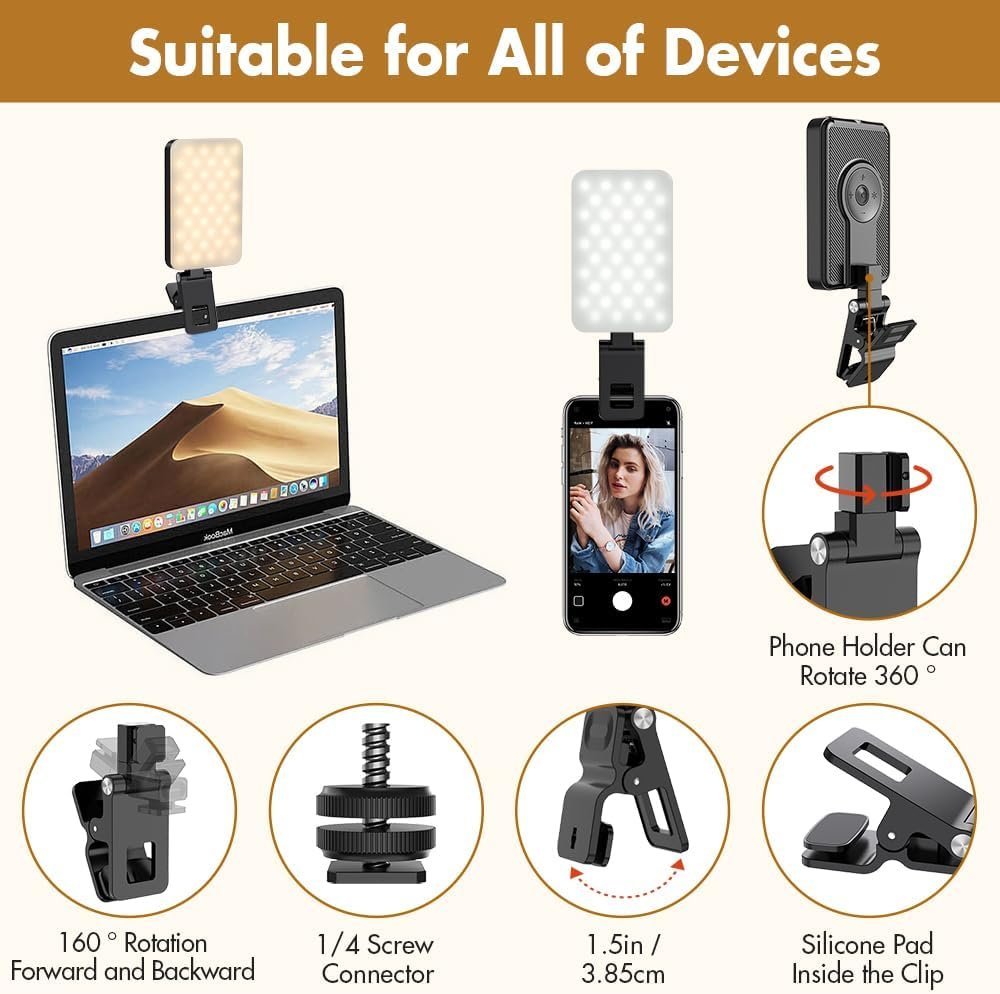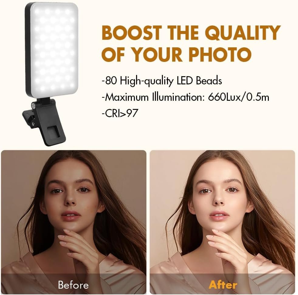 Transform your digital appearance with our sleek and slim LED phone light. Designed to enhance your webcam presence, it is ideal for selfies, photography, videography, and live streaming. Its rotatable design offers exceptional flexibility, allowing you to capture high-quality content that makes you look both glamorous and radiant. Compatible with phones, laptops, and cameras, this selfie light is your go-to accessory for professional-grade lighting.